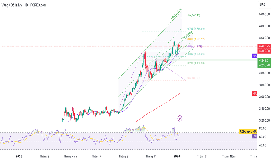 Ở phía trên, vùng 4.540 – 4.580 USD đang đóng vai trò kháng cự gần. Nếu giá đóng cửa dứt khoát phía trên khu vực này, thị trường sẽ xác nhận thoát khỏi trạng thái tích lũy hiện tại và mở ra một chu kỳ tăng mới, với mục tiêu tiếp theo hướng về 4.700 – 4.750 USD, xa hơn là vùng 4.900 – 5.000 USD theo trục kênh giá trung hạn.