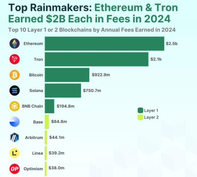 Ethereum collected $2.48 billion in fees over 2024, the most of any blockchain, followed by Tron, which brought in $2.15 billion. Bitcoin BTCUSD came in third place, earning $922 million, according to a Jan. 21 CoinGecko report.