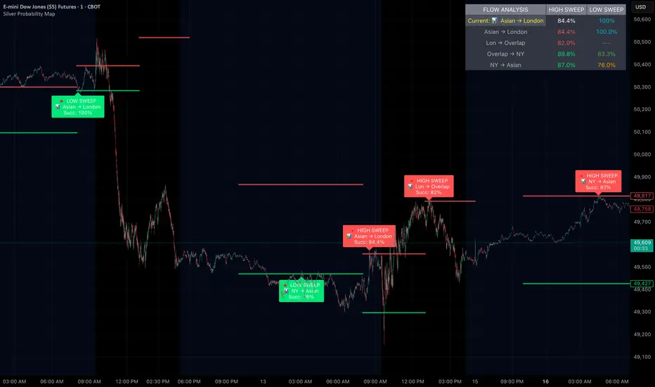 It studies how price behaves when transitioning from one major trading session to the next, then maps statistically favorable reactions to prior session highs and lows.