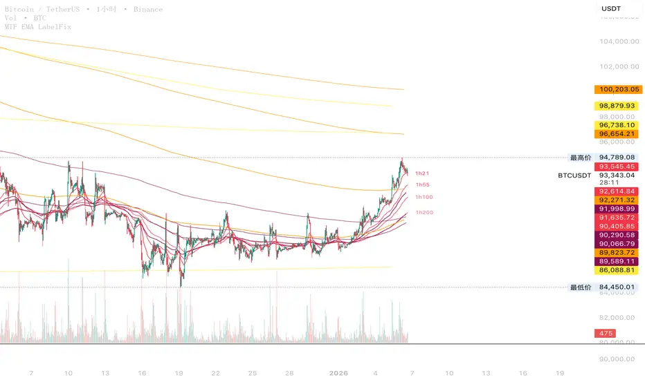 这是一个多时间级别EMA嵌套的显示方式。在一小时窗口下,可以看到当下K线的上下是否有关键均线的阻力,以便做出有效判断,免去了切换不同时间窗口和多重报警的反复切换。