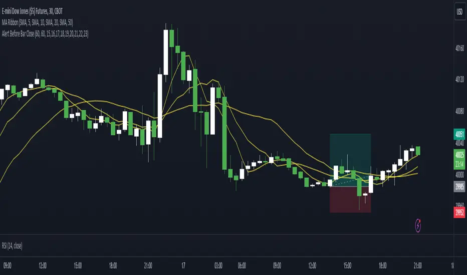 This indicator/alert mechanism is unique in two ways. First, it provides alerts before the close of a candlestick, allowing time-based traders to prepare early to determine if the market is about to form a setup. Second, it introduces an observation time mechanism, enabling time-based traders to observe when the market is active, thereby avoiding too many false signals during electronic trading or when trading is light.