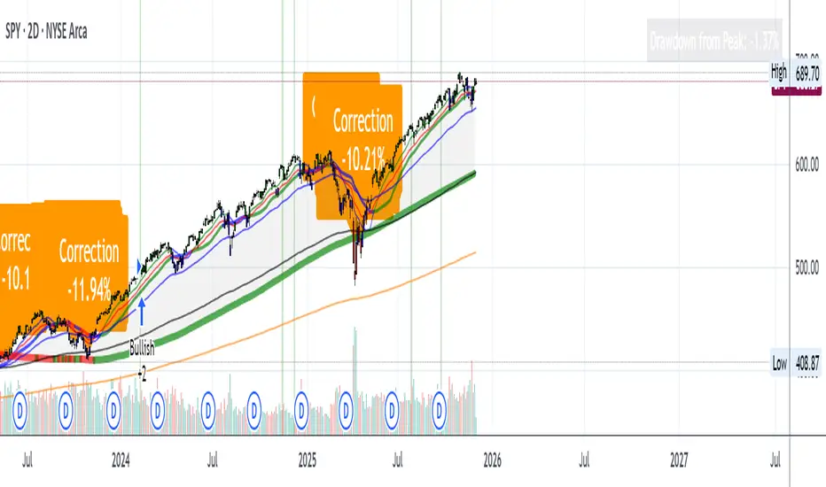 These levels are displayed directly on the chart, along with a live drawdown reading from the most recent peak.