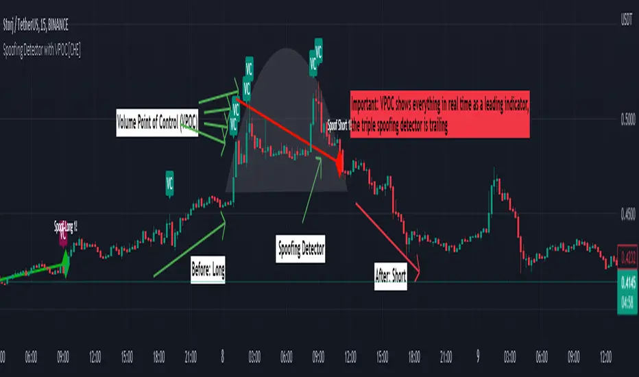 This is a Pine Script code for a spoofing detector and volume point of control (VPOC) indicator. The purpose of the indicator is to detect and highlight potential spoofing activities in the market, as well as to plot the volume point of control on the chart.