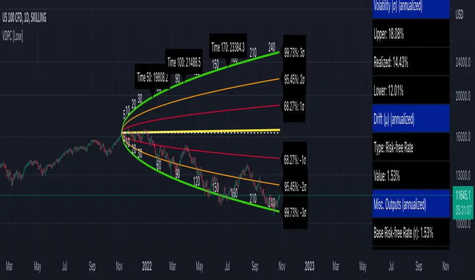 Indicator can be used on any timeframe. The T (time) variable used to annualize volatility and inside the GBM formula is automatically calculated based on the timeframe of the chart.