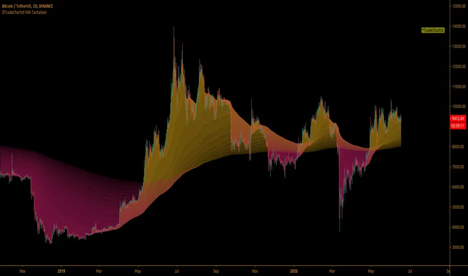 ™TradeChartist MA Tantalizer is a free to use, elegantly designed script for MA based traders and it offers a range of useful Moving Averages based plots including MA fishnet/Tantalizer ribbon and custom multi time frame MAs with crosses based on user input. The script's visually appealing design and its functionality offers a pleasing experience for the users, thereby complementing their analysis and helps understand asset's price action better.