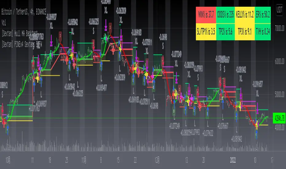 The second layer: "{Sextan} PINEv4 Sextans Backtest Framework". This script is the standardized trading system strategy execution and alarm, used to generate the final report of the strategy backtest and some key indicators that I have customized that I find useful, such as: winning rate , Odds, Winning Surface, Kelly Ratio, Take Profit and Stop Loss Thresholds, Trading Frequency, etc. are evaluated according to the Kelly formula. To use the second layer, first load it into the TrainingView chart, no markers will appear on the chart, since you have not specified any strategy source signals, click on the gear-shaped setting next to the "{Sextan} PINEv4 Sextans BTFW" header button, you can open the backtest settings, the first item is to select your custom strategy source. Because we have added the strategy source to the chart in the previous step, you can easily find an option "{Sextan} Your Indicator Source: Signal" at the bottom of the list, this is the strategy source input we need, select and confirm , you can see various markers on the main graph, and quickly generate a backtesting profit graph and a list of backtesting reports. You can generate files and download the backtesting reports locally. You can also click the gear on the backtest chart interface to customize some conditions of the backtest, including: initial capital amount, currency type, percentage of each order placed, amount of pyramid additions, commission fees, slippage, etc. configuration. Note: The configuration in the interface dialog overrides the same configuration implemented by the code in the backtest script.