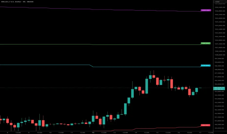- Custom End-of-Line Labels: Personalized text (e.g., "Daily 200 EMA" or "21W EMA") that sticks perfectly to the end of each MA line, just below for maximum visibility.