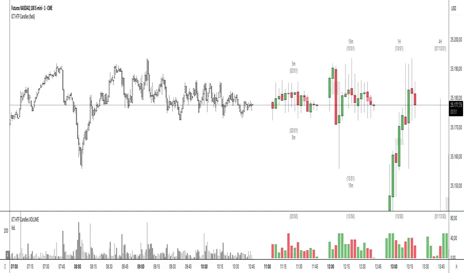 This indicator is linked to the ICT HTF CANDLES indicator. Drawing a configurable higher timeframe on the current chart helps visualize price movement without changing timeframes, as Fadi says. However, if you also add volume for the people who work with it, it's even more helpful. It helps you see where we have volume spikes in high timeframes and where there's a lack of interest. This indicator is configured the same as Fadi's, since the code is his own, only adapted to volume.