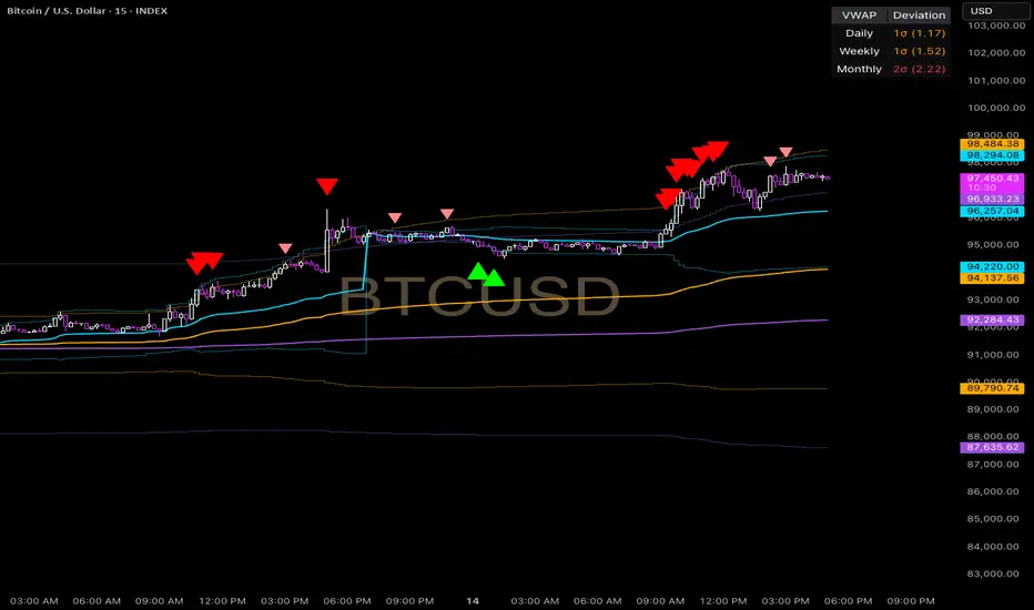 Tactical Deviation shows daily/weekly/monthly VWAP lines with optional standard deviation bands and signal markers when price reaches configured deviation levels and optional filters are met. It is intended to provide statistical context around price distance from VWAP and highlight areas to review.