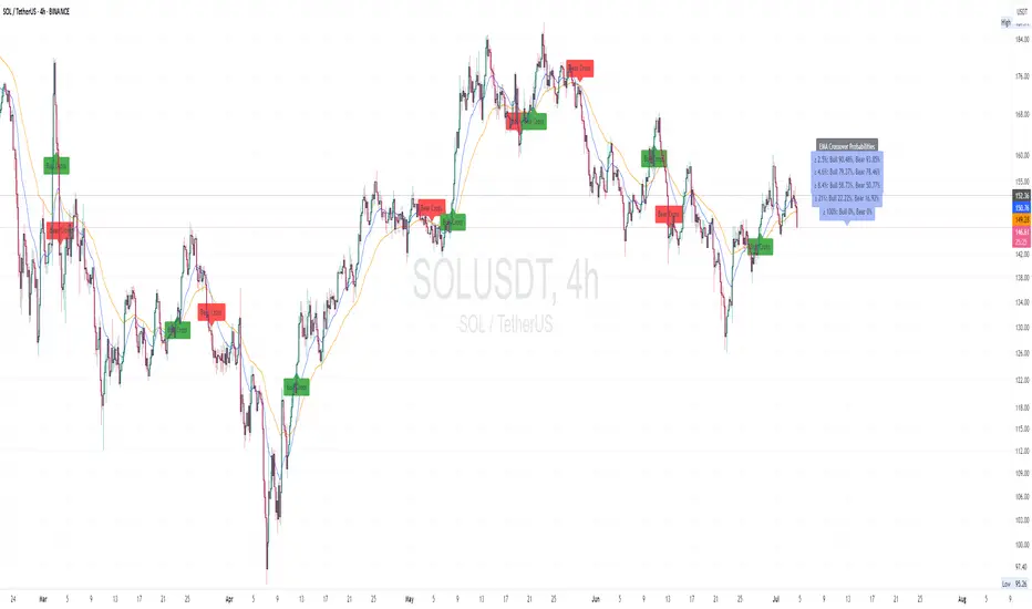 Probability Calculation: Analyses historical crossover data to compute the probability of price changes meeting or exceeding customizable percentage thresholds (e.g., 2.5%, 5%). Probabilities are displayed as labels on the last bar, showing both bullish and bearish outcomes.