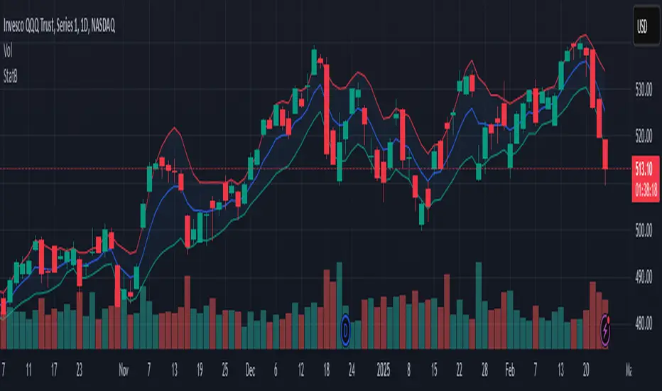 This TradingView indicator, "Statistical Bands" (short title "StatB"), creates a dynamic envelope around a smoothed baseline by combining noise reduction techniques with volatility measurement. It offers several smoothing methods—including various moving averages and a Kalman filter option—and calculates upper and lower bands based on either standard deviation or ATR, allowing traders to visualize potential support/resistance and volatility levels.