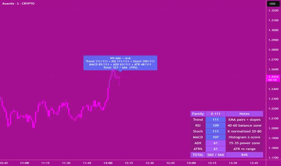 Tip: Strong trends often show high Trend + ADX + MACD; emerging expansions show rising ATR %; choppy conditions show softer, mixed family scores.