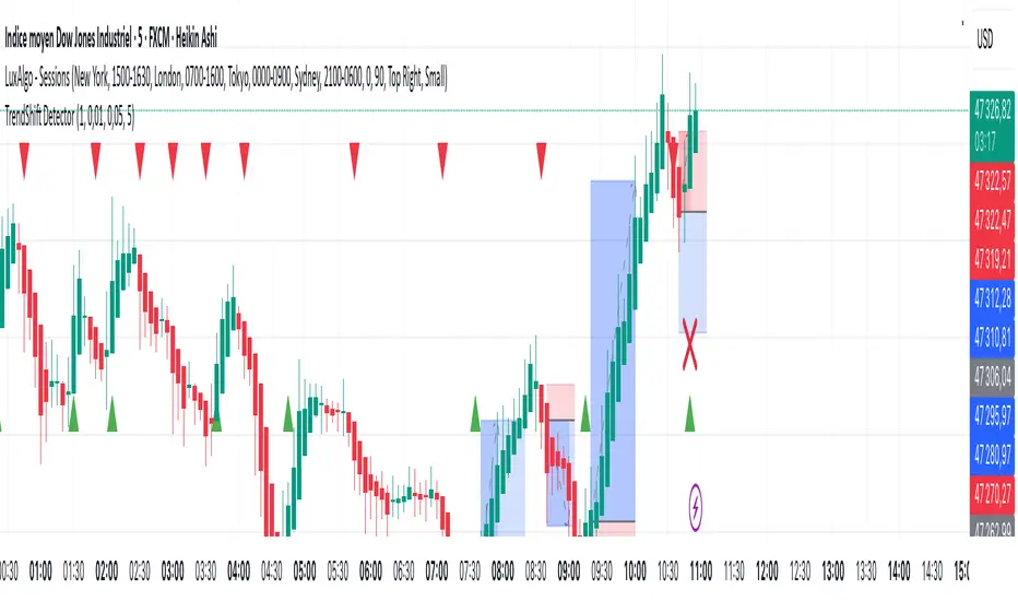 Trend reversal detector based on no-wick candle analysis at the opening side. Identifies momentum shifts by marking the first reversal candle after a bullish or bearish sequence. The indicator scans up to 5 candles after a color change to detect the first candle without wick on the opening side (red candle with no upper wick or green candle with no lower wick). Clear visual signals with colored triangles. Fully customizable parameters including minimum sequence length, body size percentage, wick tolerance, and lookback period to adapt to all trading styles.