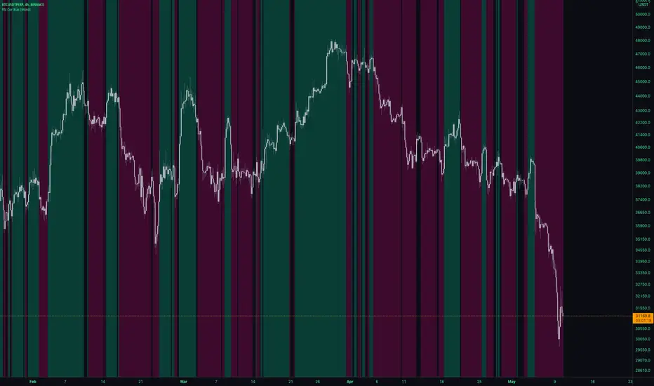 This is a pretty simple script. It gives a background directional bias color respective to RSI levels from input thresholds in the settings. Users can choose the upper and lower thresholds and the symbol that the RSI is from.