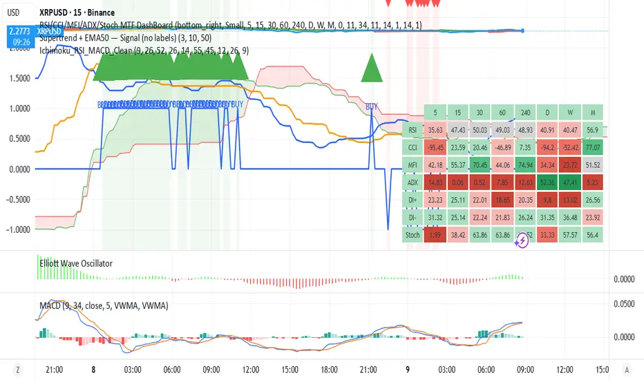 Ichimoku + RSI + MACD indicator. It combines these three indicators. It tells whether the trend is bullish or bearish. Multi-timeframe.