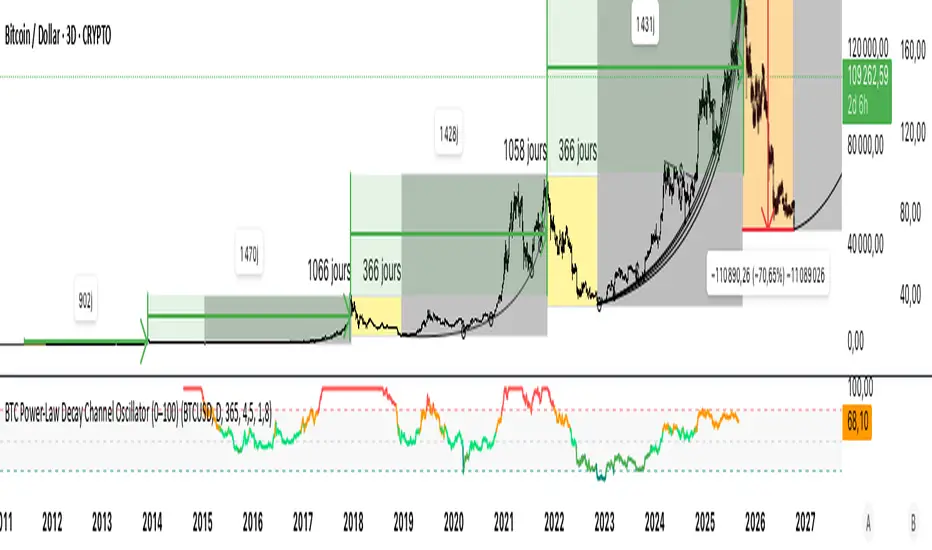 This indicator calculates Bitcoin’s position inside its long-term power-law decay channel and normalizes it into an easy-to-read 0–100 oscillator.