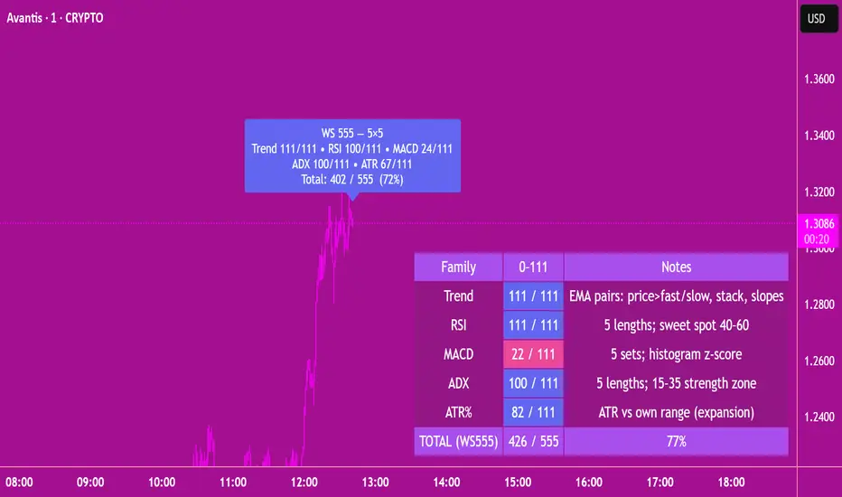 A lightweight multi-factor “market weather” meter. It evaluates 5 indicator families, each with 5 parameter variants, normalizes them, and aggregates to a composite 0 → 555 readiness score with GO / NO-GO alerts, a draggable badge, painted bars, and a mini table.