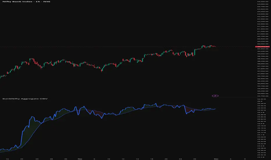 This indicator calculates the aggregate On Balance Volume (OBV) of the entire Bank Nifty Index by analyzing its 12 individual constituents rather than the index futures volume.