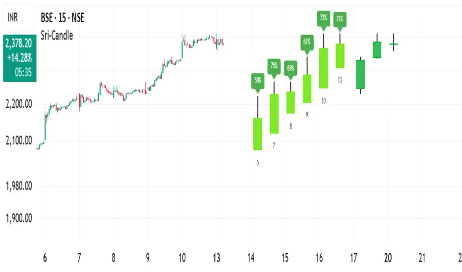 The Sri - Daily & Weekly Candle Strength indicator is designed to visually display recent daily and weekly candle activity directly on your chart, highlighting buyer and seller dominance for each candle. It helps traders quickly assess the strength of bullish vs bearish pressure over recent periods and can be used with both Normal and Heikin Ashi candles. This tool is particularly useful for swing traders, position traders, and technical analysts who want a clear view of candle momentum without switching timeframes.