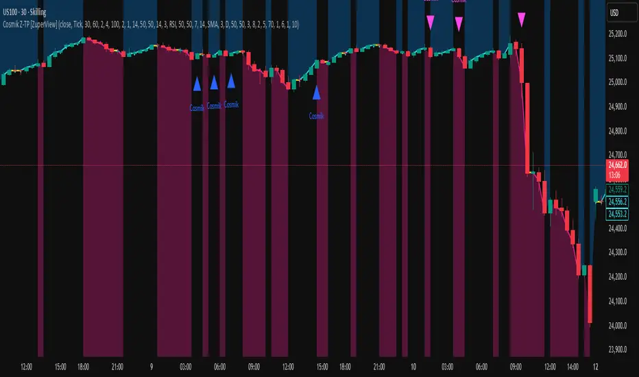 Cosmik Z-TP highlights market direction and strength through its Trend Vector and Trailing Stop line, providing clear visual cues for quick trend analysis and trend confirmation.