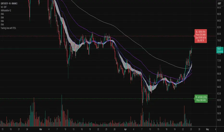 This indicator plots dynamic Take Profit (TP) and Stop Loss (SL) levels based on customizable percentages above and below the current price. It calculates and displays:Your total trade value based on capital and leverage