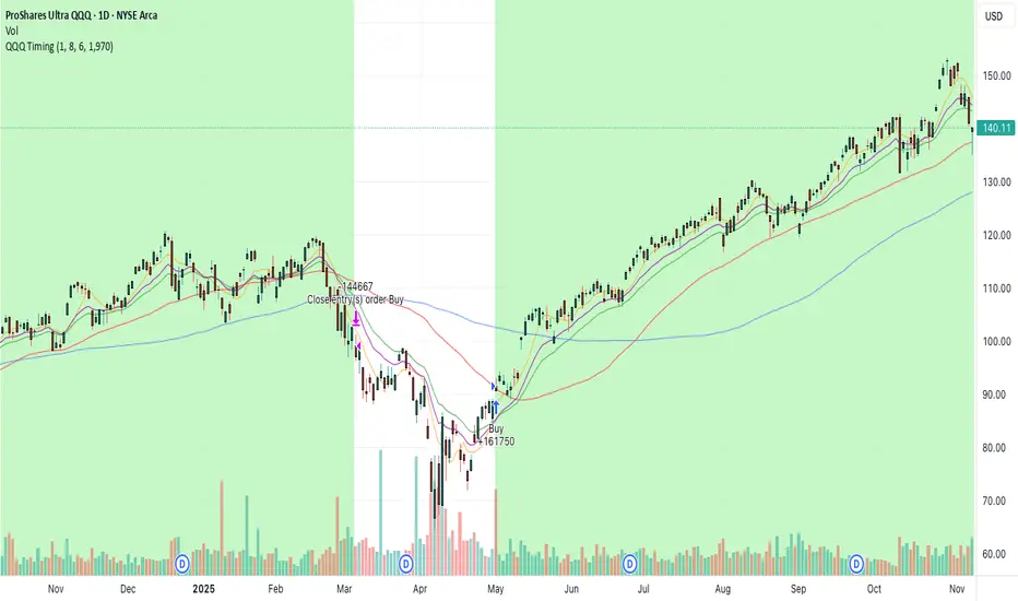 This is a trend-following position trading strategy designed for the QQQ and the leveraged ETF QLD (ProShares Ultra QQQ). The primary goal is to capture multi-month holds for maximal profit.