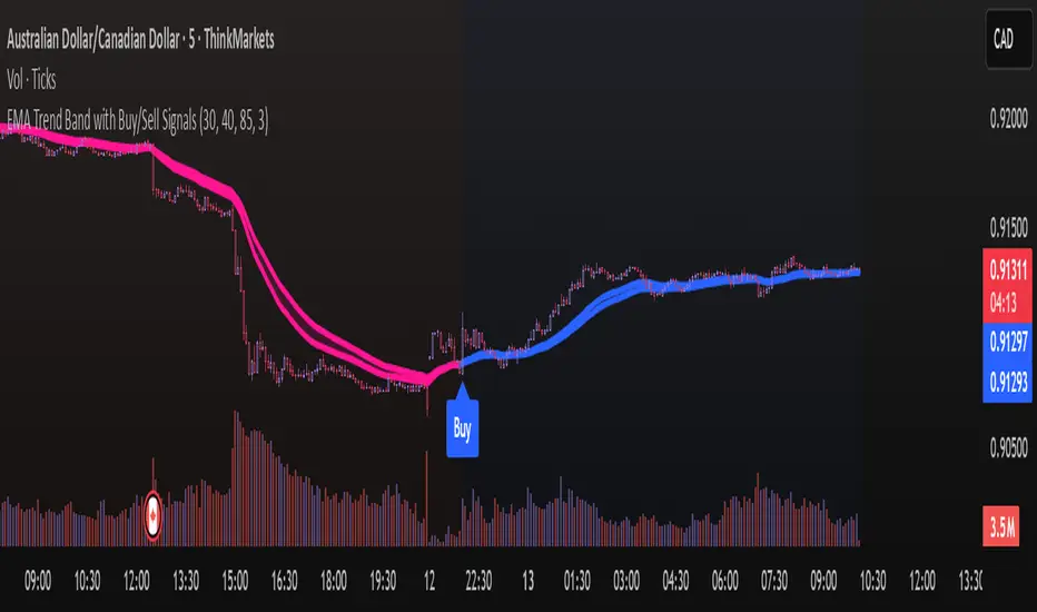 The **EMA Trend Band with Buy/Sell Signals** is a powerful visual trend-following indicator that combines two exponential moving averages (30-period fast EMA and 40-period slow EMA) to identify market direction and generate clear trading signals.[1][3]