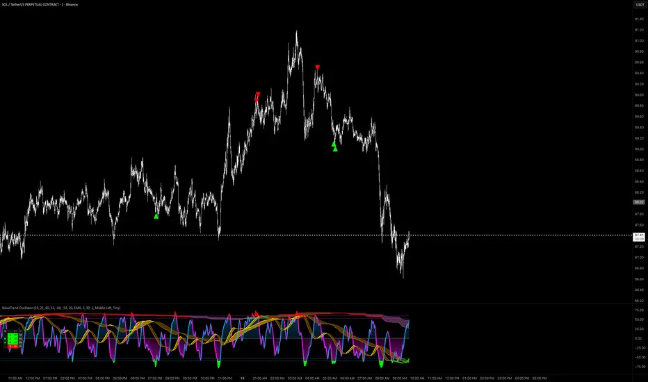 The base WaveTrend calculation (EMA of HLC3 → absolute deviation smoothing → normalized CI → EMA to WT1 → SMA to WT2) is a known public-domain algorithm. The originality of this indicator is in the three systems built on top of it.