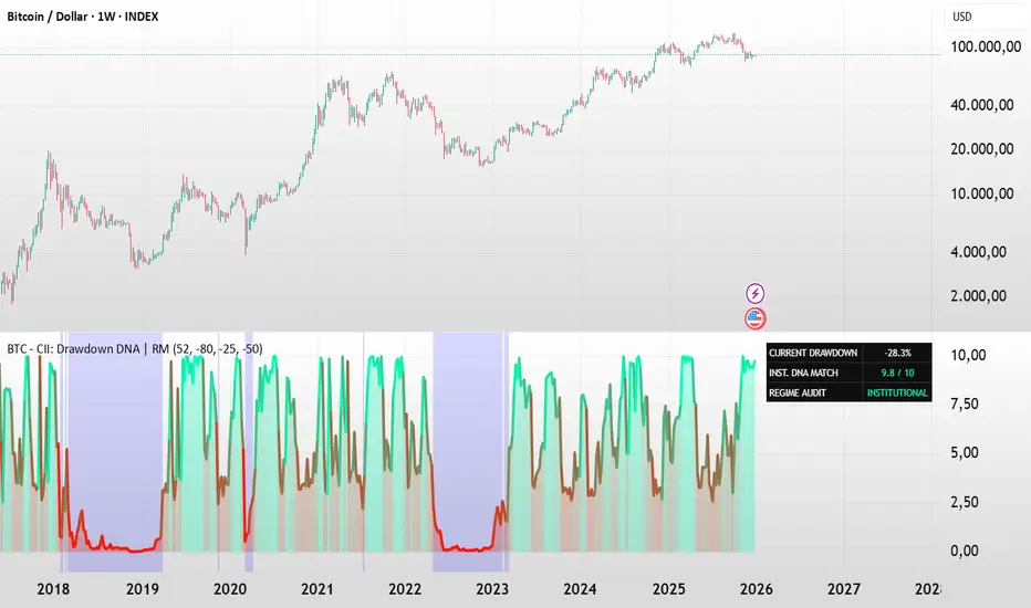 The closer the price stays to this -25% target, the higher the Integrity Score (10/10). By providing unique "DNA Match" calculations and background shading based on specific threshold crossings, this indicator provides utility beyond standard price-change indicators. It allows you to mathematically distinguish between an "Institutional Rebalancing" and the start of a "Legacy Cycle-Ending Termination."