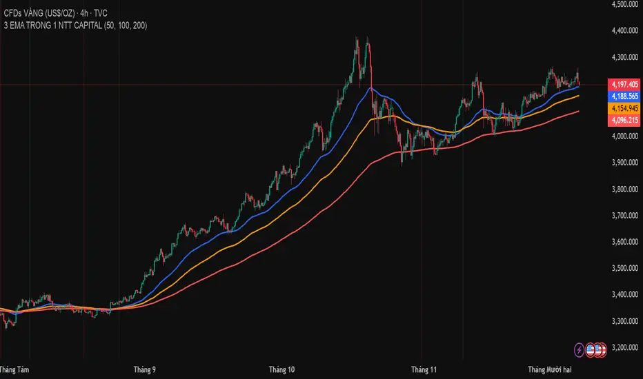The 3 EMA in 1 NTT CAPITAL indicator provides an overview of the market trend with three EMAs of different periods, helping to identify entry and exit points more accurately, thus supporting traders in making quick and effective decisions.