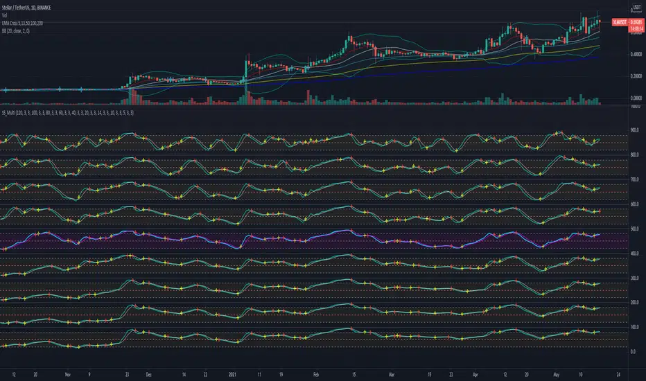 This script enables you to use 9 slow stochastic with timeframe 5, 10, 14, 20, 40, 60, 80, 100, 120; on purposes to see from longterm and short term condition of a stock.