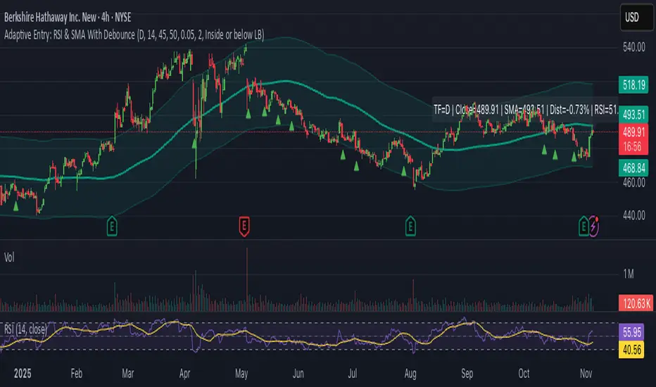 Adaptive long-entry timing using RSI on a higher timeframe and an SMA ±band price filter, with optional no-repaint confirmation and debounce.