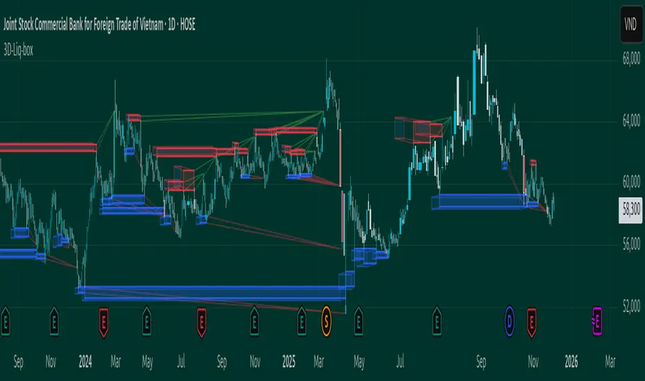 The 3D Volume Weighted Liquidity Level indicator visualizes market structure by identifying key support and resistance zones based on Pivot Highs and Lows. Unlike standard support/resistance lines, this tool adds a "3D" dimension by calculating the depth of the zone based on Accumulated Volume and Volatility (ATR). This helps traders visualize the "weighted" or significance of a specific price level.
