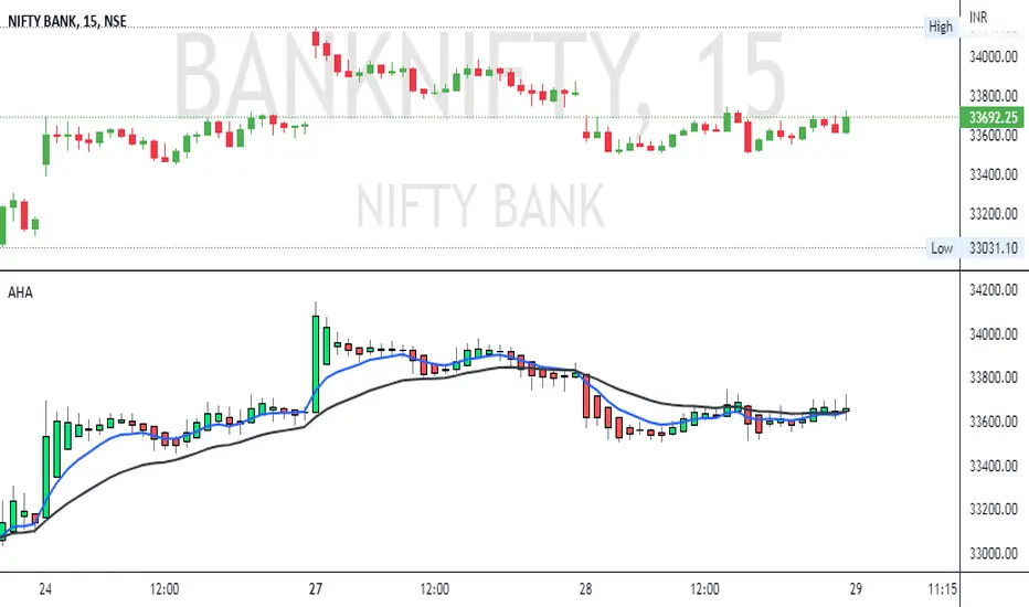 AHA allows you to have 2 EMAs (mostly used for crossovers). Default values set at 8/21 EMA which we may indicate a trend reversal.
