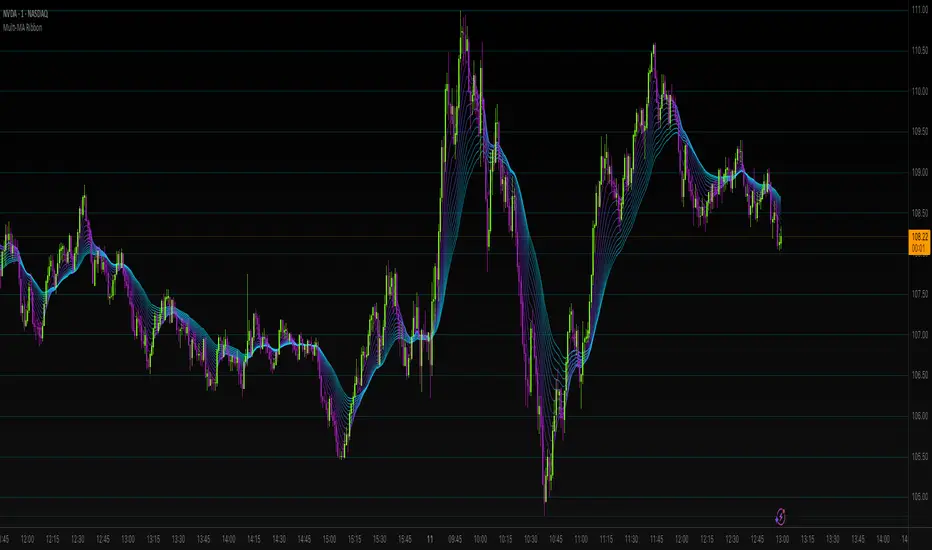 Multi-MA Ribbon is a dynamic and highly customizable indicator designed to visually compare and analyze up to 12 moving average bands simultaneously — across two different moving average (MA) types. This allows traders to study how various MAs behave relative to one another in real time, improving market analysis and trade precision.