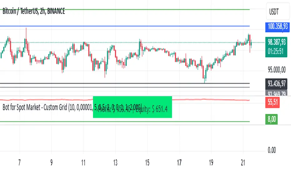 Strategy Setup: The bot is set up with a custom grid strategy, defining parameters like pyramiding (allowed number of simultaneous trades), margin requirements, commission, and initial capital.
