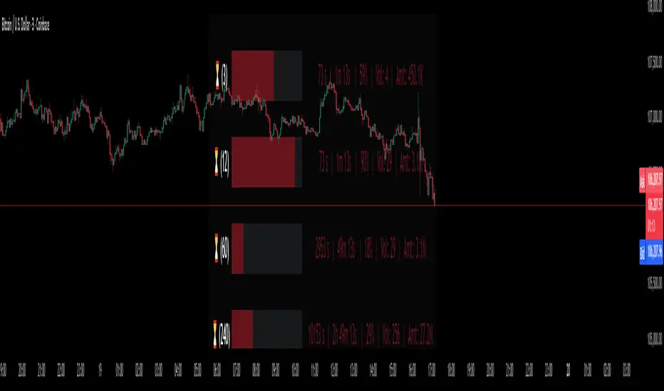 "Volume and Price Countdown Code: This code will display colors according to the closing status of different timeframes."