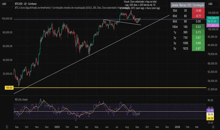 BTC vs Gold (Lag) + Correlation — multi-timeframe, publication notes