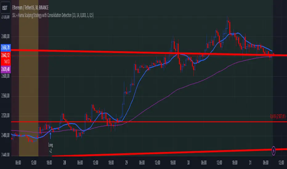 This TradingView script brings a powerful scalping strategy that combines the SSL Channel and Hama Candles indicators with a special twist—consolidation detection. Designed for traders looking for consistency in various markets like crypto, forex, and stocks, this strategy highlights clear trend signals, risk management, and helps filter out risky trades during consolidation periods.