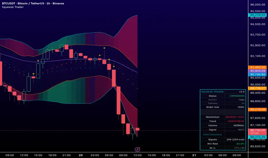 Inspired by the Bollinger Band and Keltner Channel squeeze concept popularized by John Carter’s TTM Squeeze, with added enhancements for squeeze strength, filtering, and real-time performance metrics.