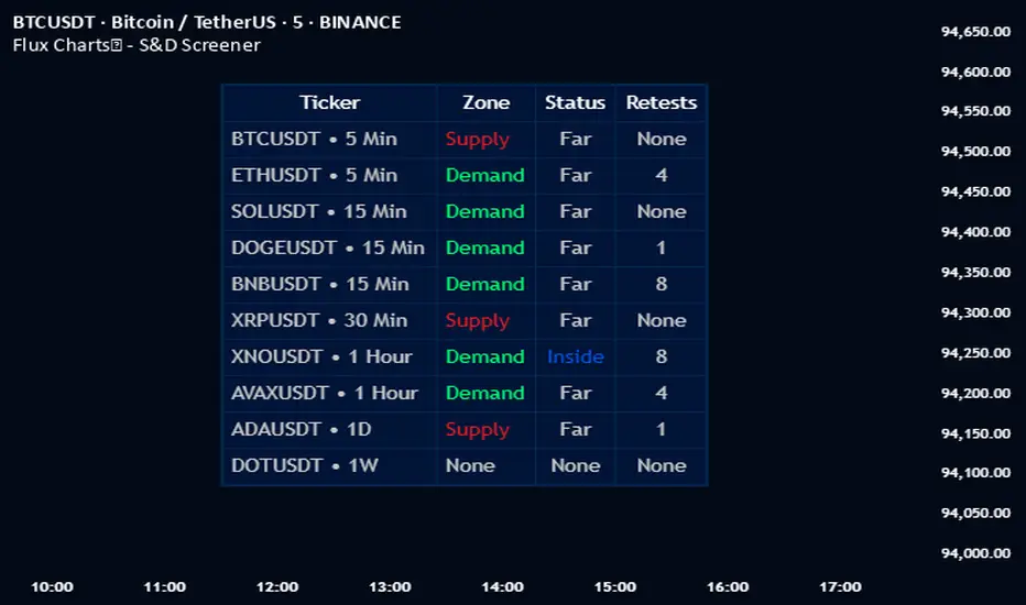 Introducing Supply & Demand Zones (S&D) Screener! This screener can spot trading opportunities for Supply & Demand traders across 8 different tickers and timeframes simultaneously! This screener offers a wide range of configurable settings, explained within this write-up.