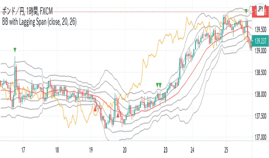 This indicator shows Bollinger bands with plus/minus 3σ bands and lagging span(called chikou span in Japanese as used in Ichimoku cloud) showing alert when lagging span crossing plus/minus 2σ bands, which are buy/sell signal respectively.