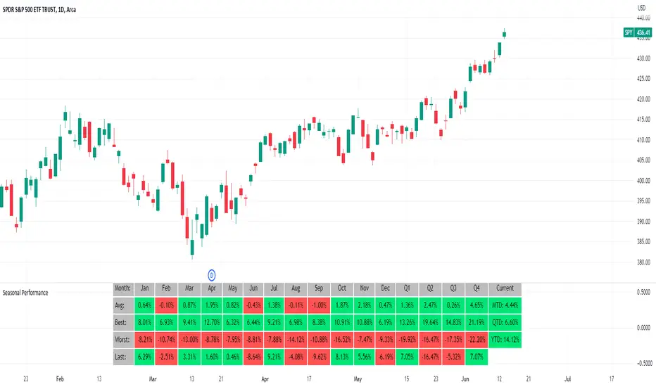 The Seasonal Performance indicator quickly allows you to see if you are in a bullish or bearish time of year for an underlying security and where the current performance stacks up compared to the same time of year historically. Table is fully customizable from colors to what data to see.