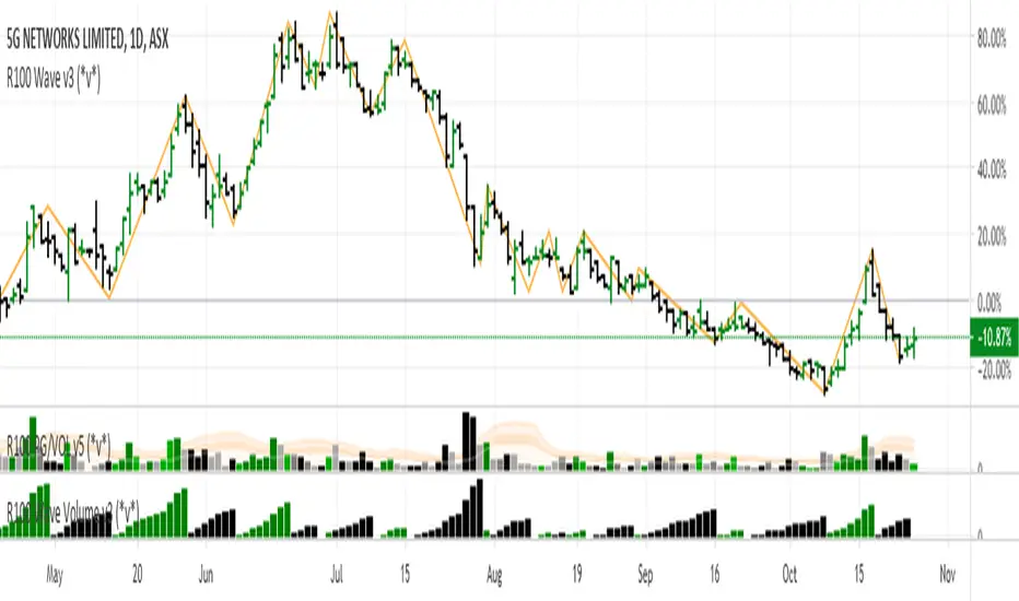 This indicator is similar to the Weis Wave Volume indicator in that it shows cumulative volume for each up and down price wave. However it is calculated differently, using the Jurik moving average to determine turning points. Use this in conjunction with the R100 Wave indicator to determine the best fit Jurik length and power settings.