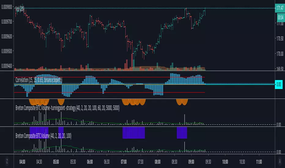 Composite BTCUSD Volume strategy compiled from 9 different exchanges, attempting to isolate turning points by trading on volume spikes and bag holding bars