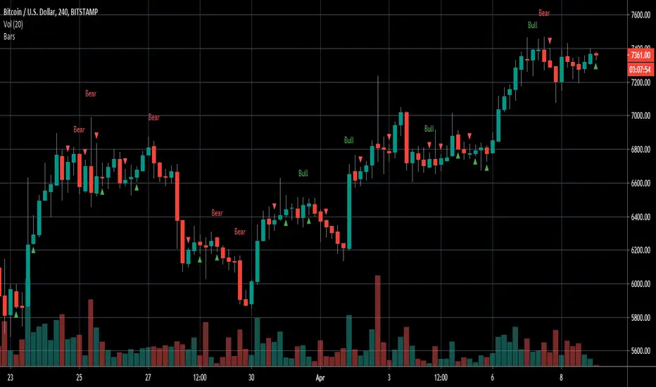 also shows text with "bull" or "bear" on top of the candle when a bullish or bearish engulfing pattern surges.