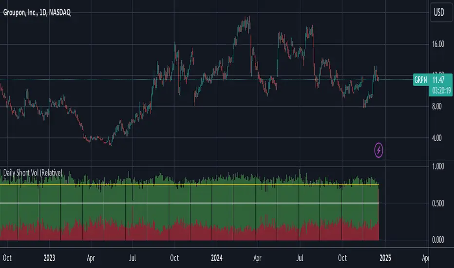 The decimal value indicates the proportion of Long to Short volume. Example, 0.40 green / 0.60 red would indicate 40% long volume / 60% short volume for that day.