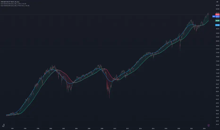 This indicator incorporates the Kaiser window, a parameterized window function with certain frequency response characteristics. By making this implementation available in Pine Script, it allows for exploration and experimentation with the Kaiser window in the context of financial time series analysis.
