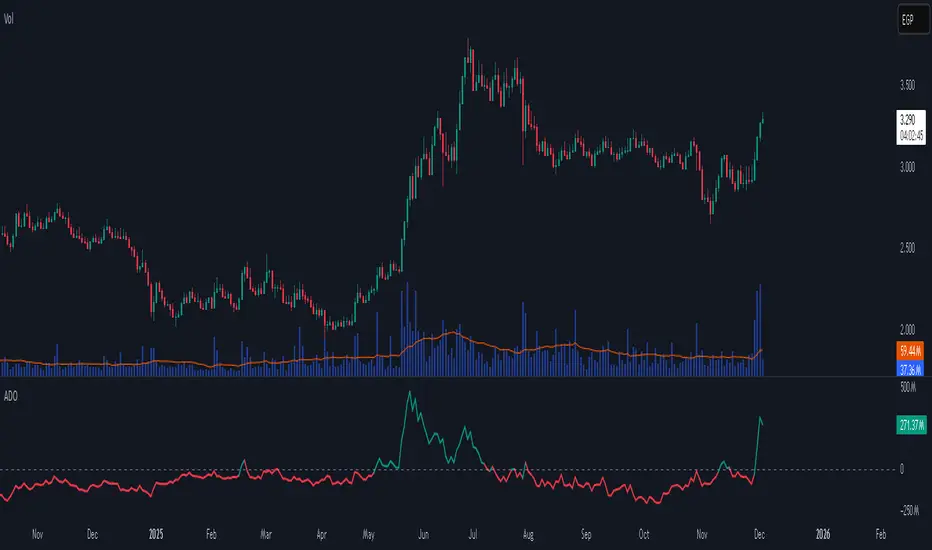 A clean, volume-weighted Accumulation/Distribution Oscillator (ADO) that highlights buying/selling pressure by comparing cumulative AD to its EMA — ideal for confirming trends, spotting divergences, and timing entries with volume context.