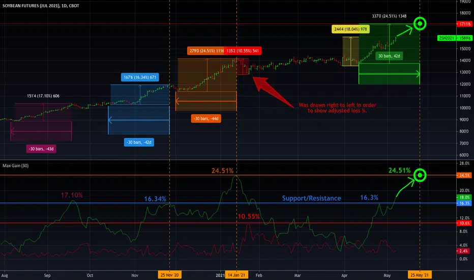 The green plot shows percentage gain from current high to the low of the previous 30 days.